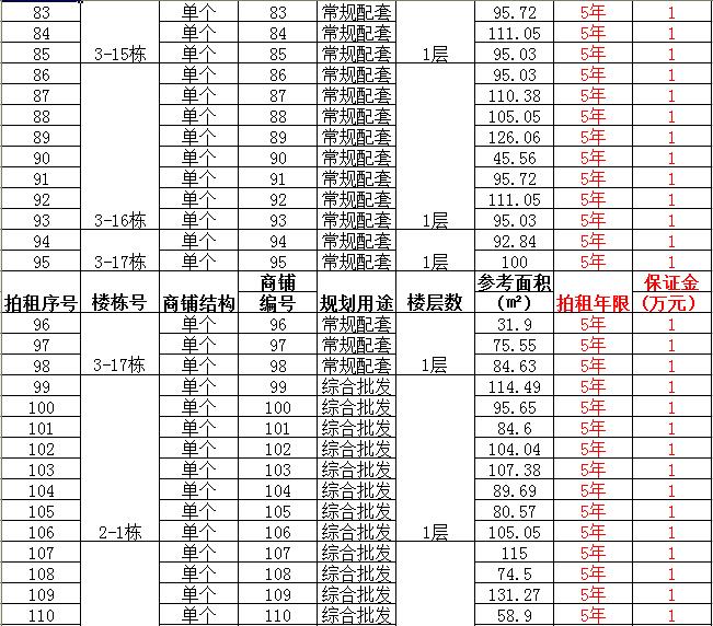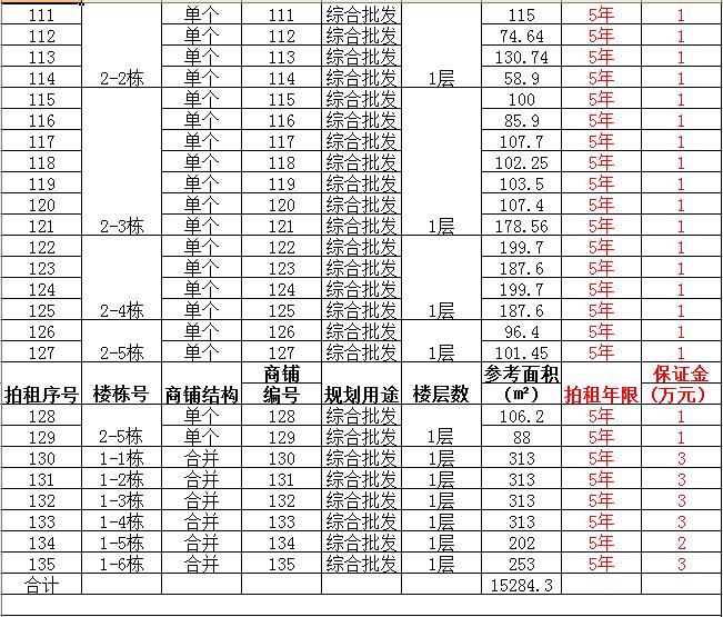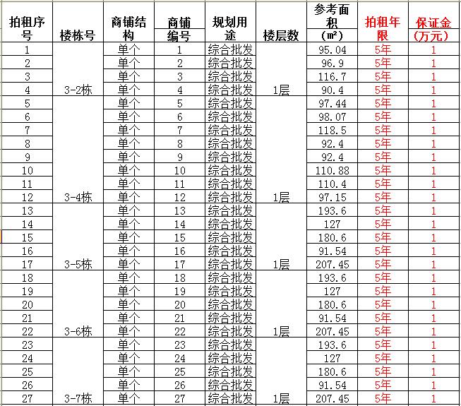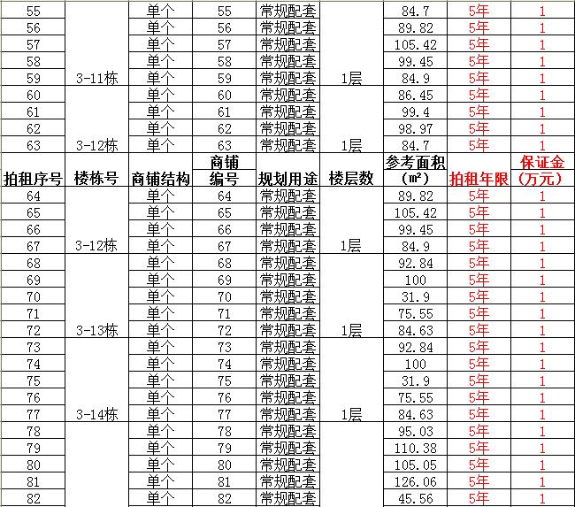 (一)拍租單個(gè)商鋪129間,使用期5年,每間商鋪預(yù)交競(jìng)租保證金1萬(wàn)元, 詳見(jiàn)商鋪簡(jiǎn)介(欲競(jìng)租多間商鋪,保證金類推);