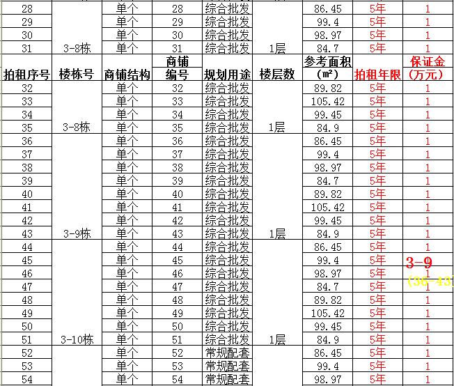 (二)拍租二個(gè)及其以上合并為一個(gè)商鋪6間,使用期5年,每間商鋪預(yù)交競(jìng)租保證金2萬(wàn)元至3萬(wàn)元不等,詳見(jiàn)商鋪簡(jiǎn)介(欲競(jìng)租多間商鋪,保證金類推)。
