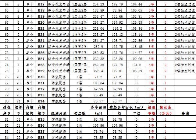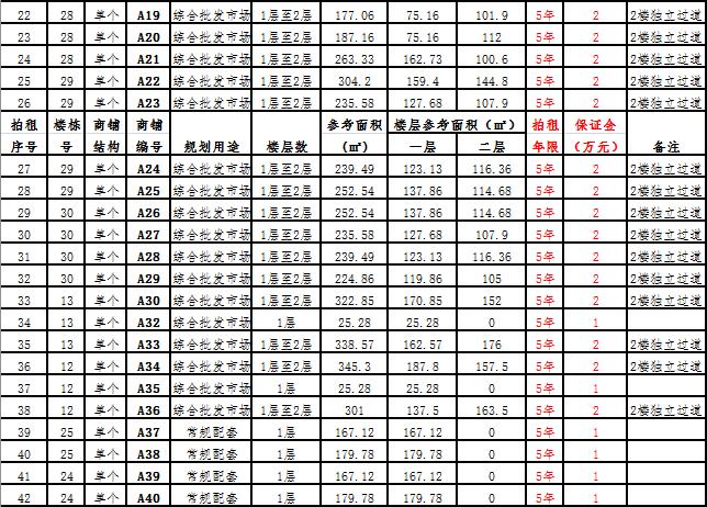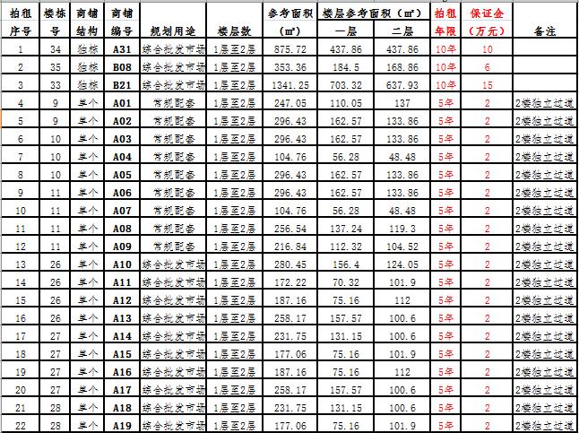 (三)拍租一層單個(gè)商鋪26 間,使用期5年,每間商鋪預(yù)交競(jìng)租保證金1萬元, 詳見商鋪簡介(欲競(jìng)租多間商鋪,保證金類推)。