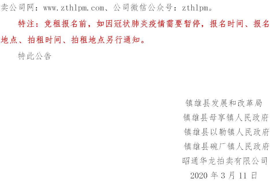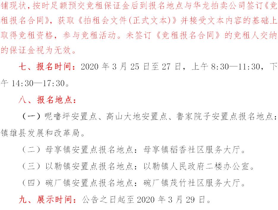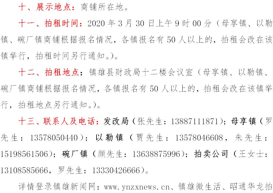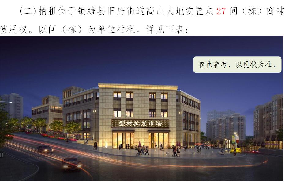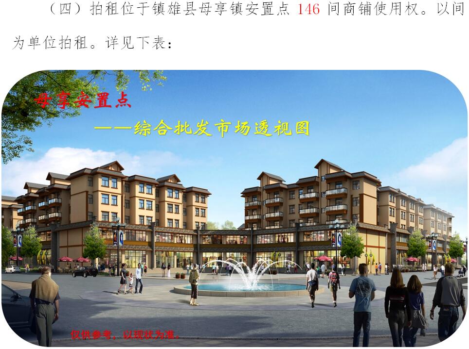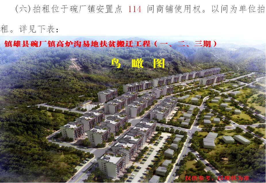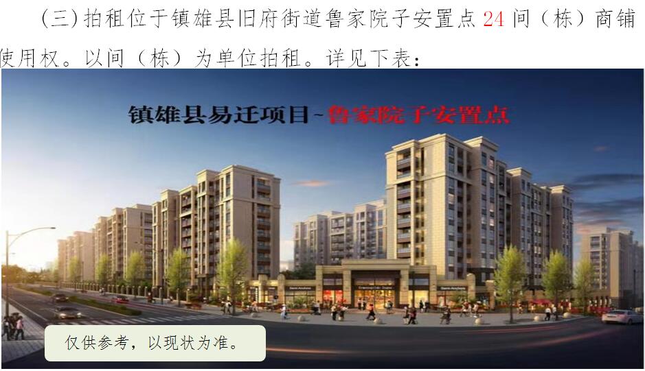 經(jīng)鎮(zhèn)雄縣人民政府批準,受相關部門(政府)委托,公開拍租位于鎮(zhèn)雄縣易地扶貧搬遷工程呢嚕坪安置點7棟獨立商鋪使用權(quán)、高山大地安置點27間(棟)商鋪使用權(quán)、魯家院子安置點24間(棟)商鋪使用權(quán)、母享安置點146間商鋪使用權(quán)、以勒物流城安置點67間(棟)商鋪使用權(quán)、碗廠安置點114間商鋪使用權(quán)。相關事項如下: