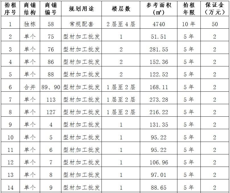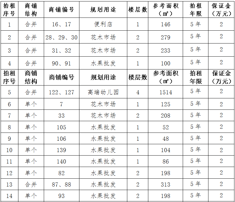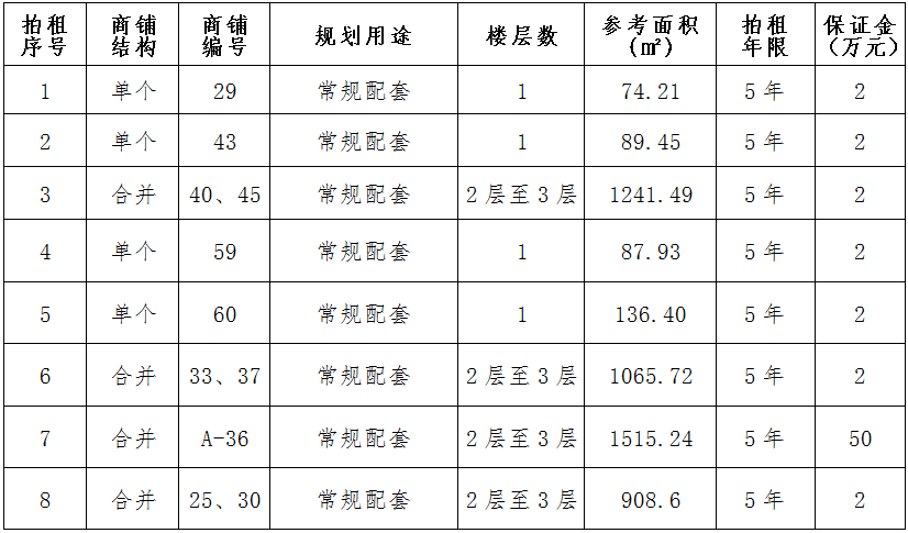 (一)拍租位于鎮(zhèn)雄縣南臺(tái)街道呢嚕坪安置點(diǎn)8間商鋪使用權(quán)。以間為單位拍租。詳見下表: